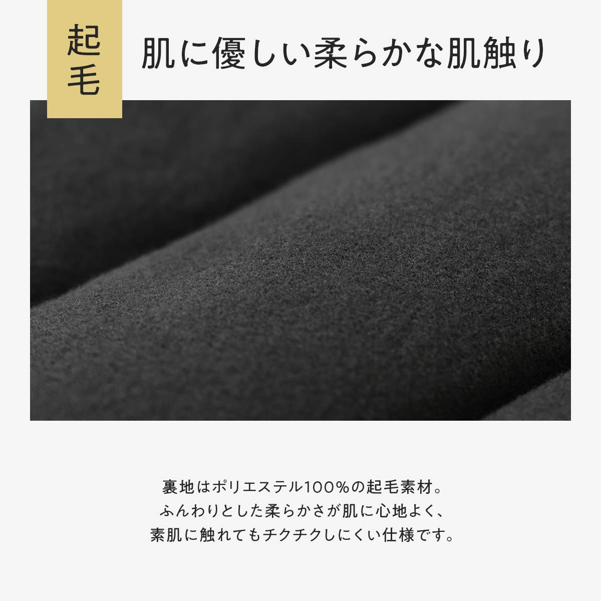 肌に触れる裏地部分にはポリエステル起毛生地を使っています。寒い季節の着用の際にも冷たく感じることなく着けることができます、また素材が柔らかでチクチクしにくいので長時間でもストレスが少なく着用していただけます。