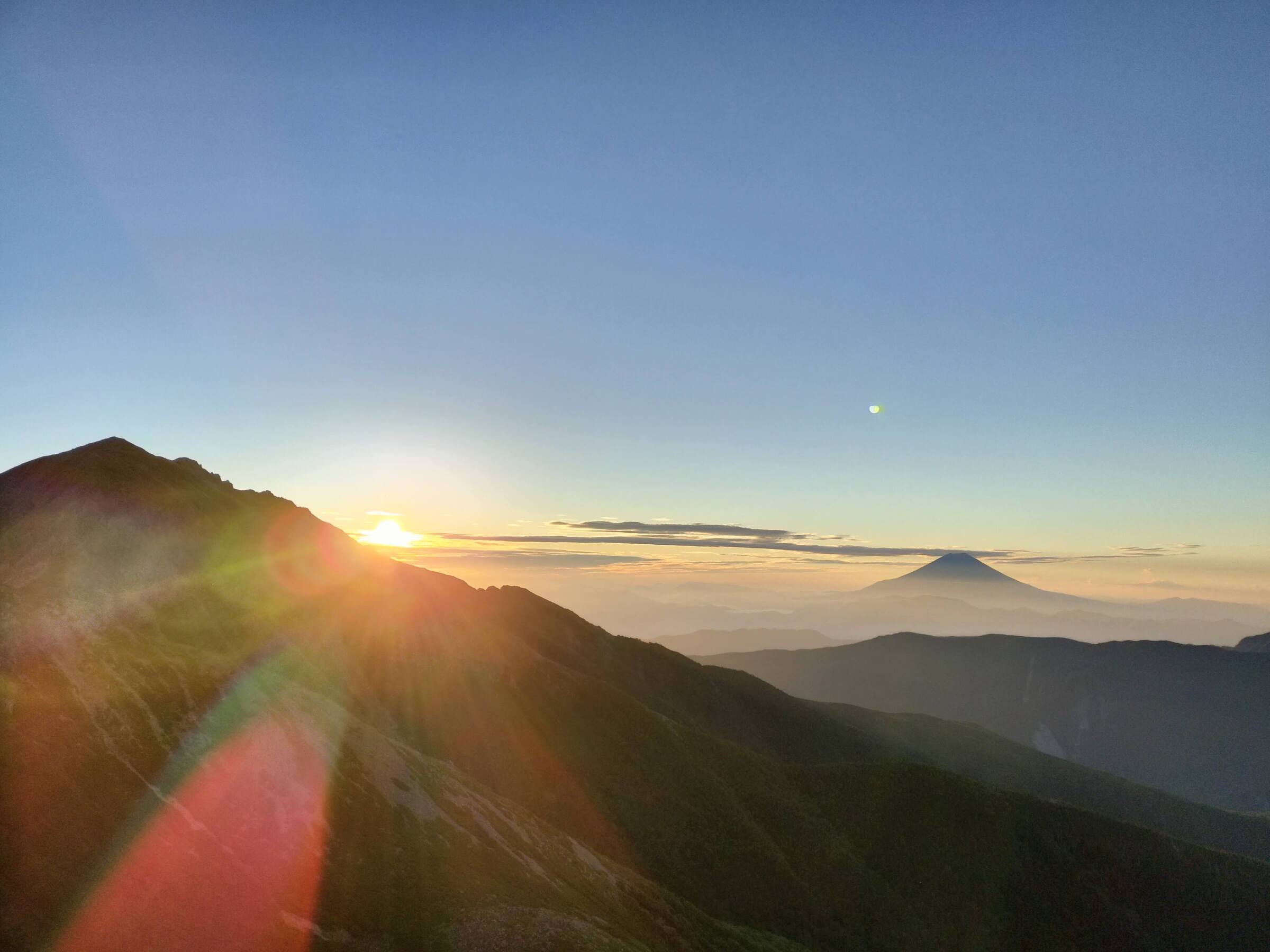 2時に出発して荒川前岳でご来光。富士山もくっきり見えて最高の朝!